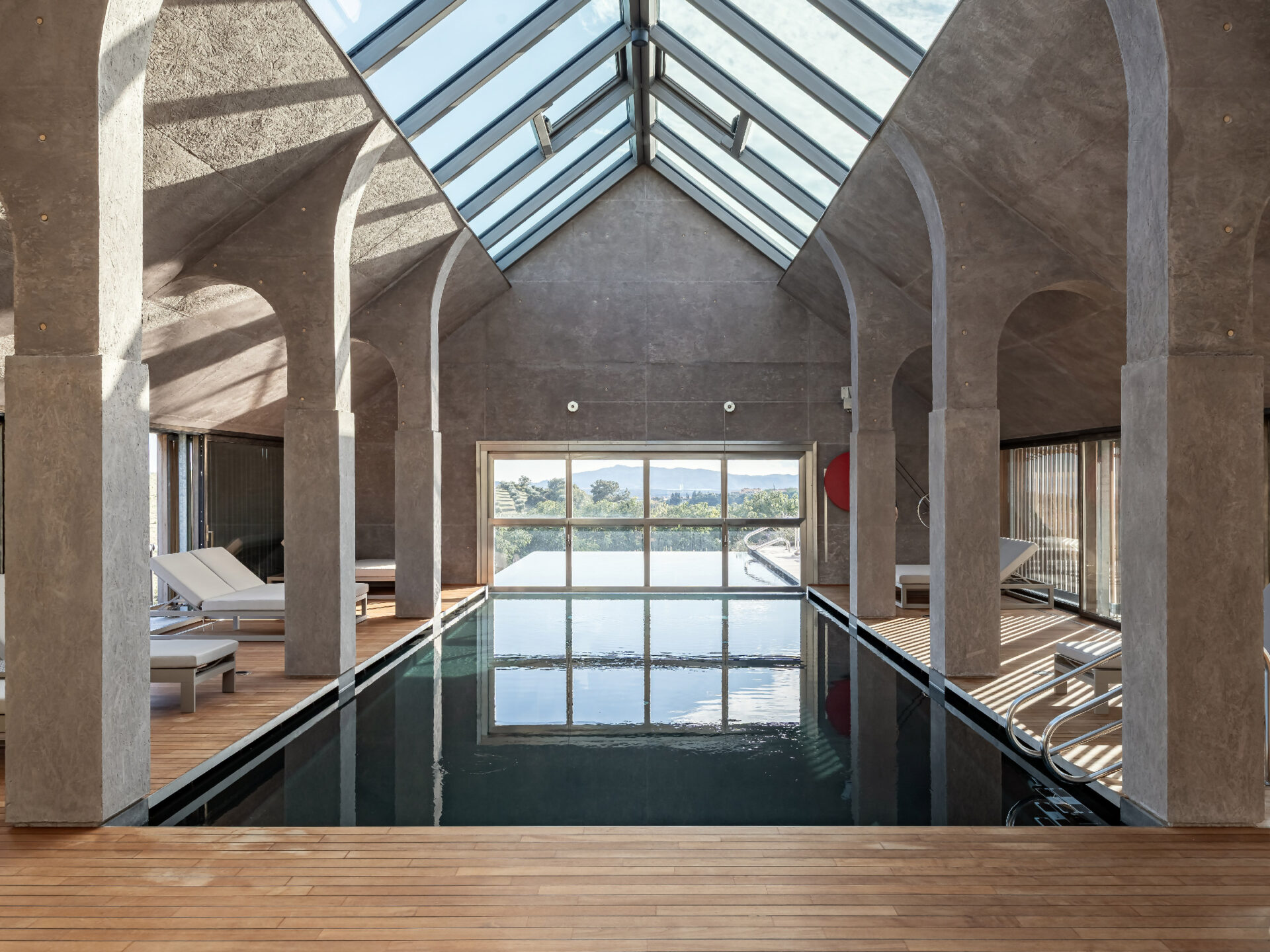 The service buildings also offer a fresh interpretation of traditional rural structures: the indoor pool in the former stable block features a double-curved concrete shell and uses overhead light and natural ventilation to create a passively designed, energy-efficient environment that can self-regulate without requiring intrusive heating or cooling systems.