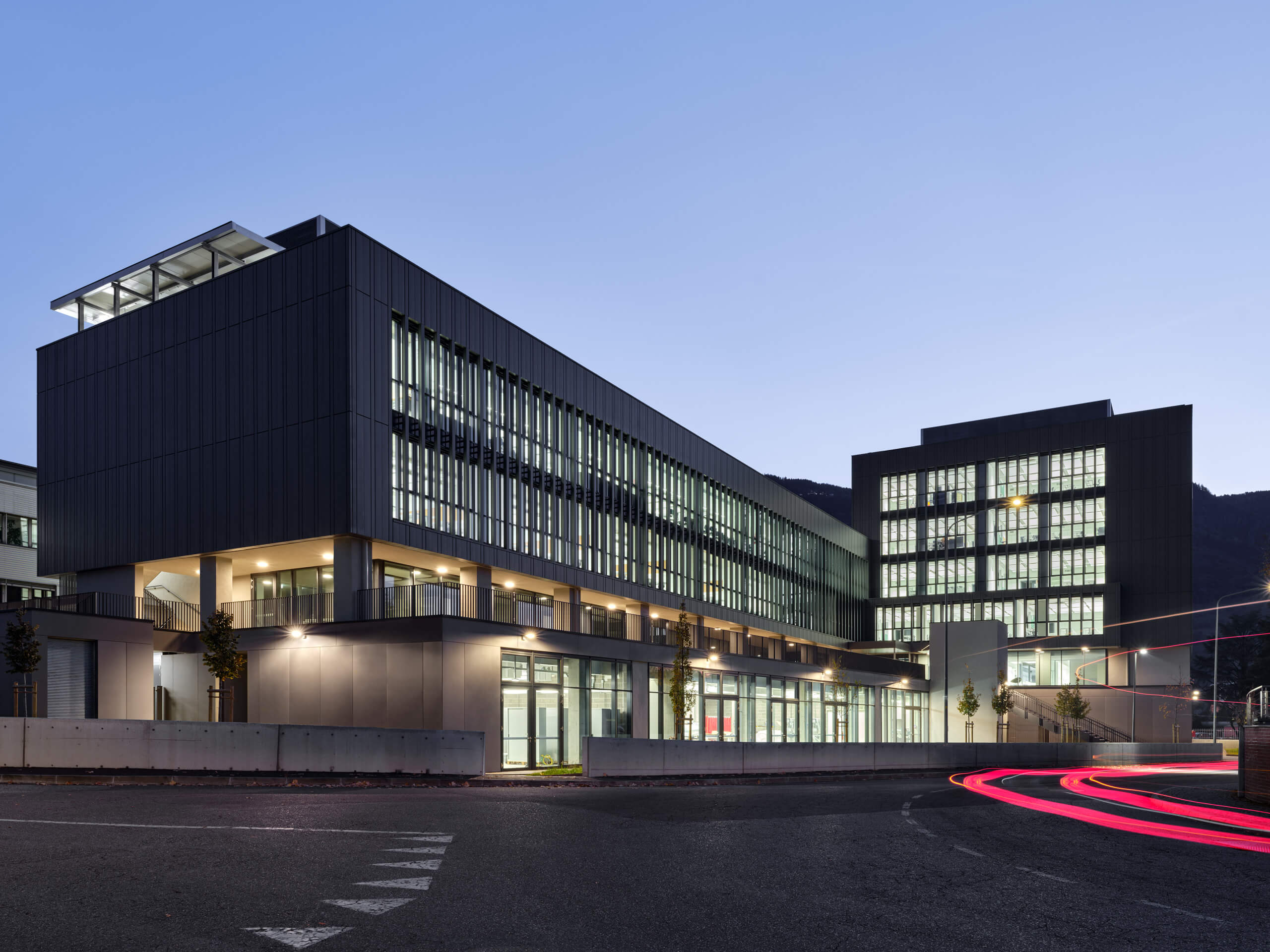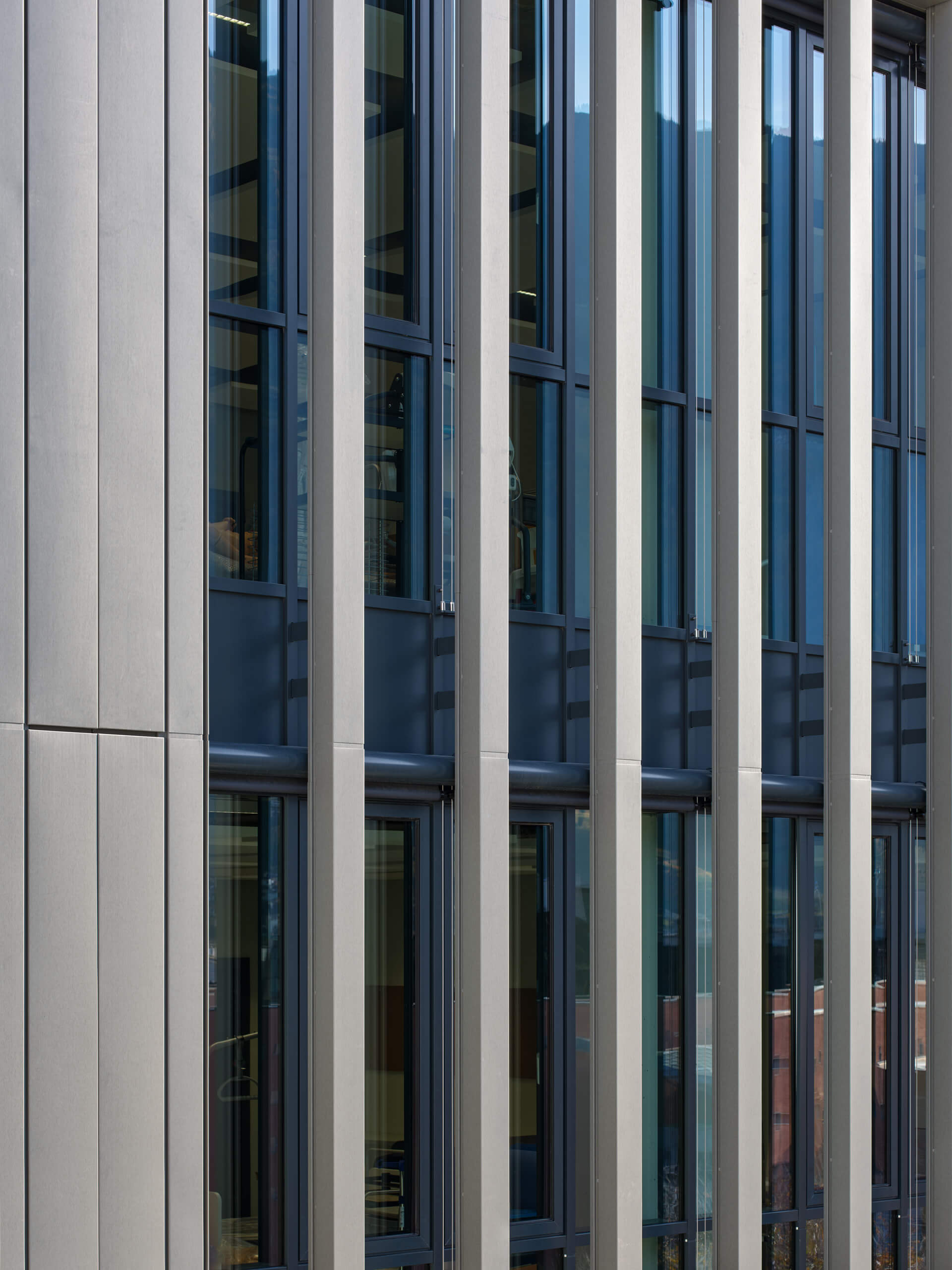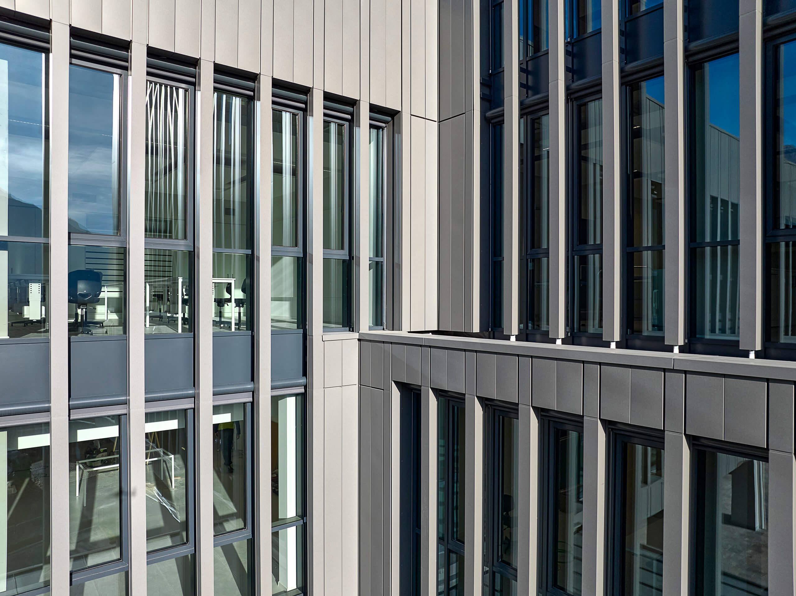 Anche l’involucro è stato progettato per limitare le dispersioni termiche. Si è optato per una facciata continua ad alte prestazioni, che combina un rivestimento metallico in zinco-titanio zintek® con uno strato di isolamento sulla struttura muraria: una soluzione che contrasta sia le dispersioni invernali sia i surriscaldamenti estivi, grazie a sistemi di schermatura esterna integrati. Le superfici vetrate sono realizzate con vetri basso-emissivi per limitare la perdita di calore in inverno.