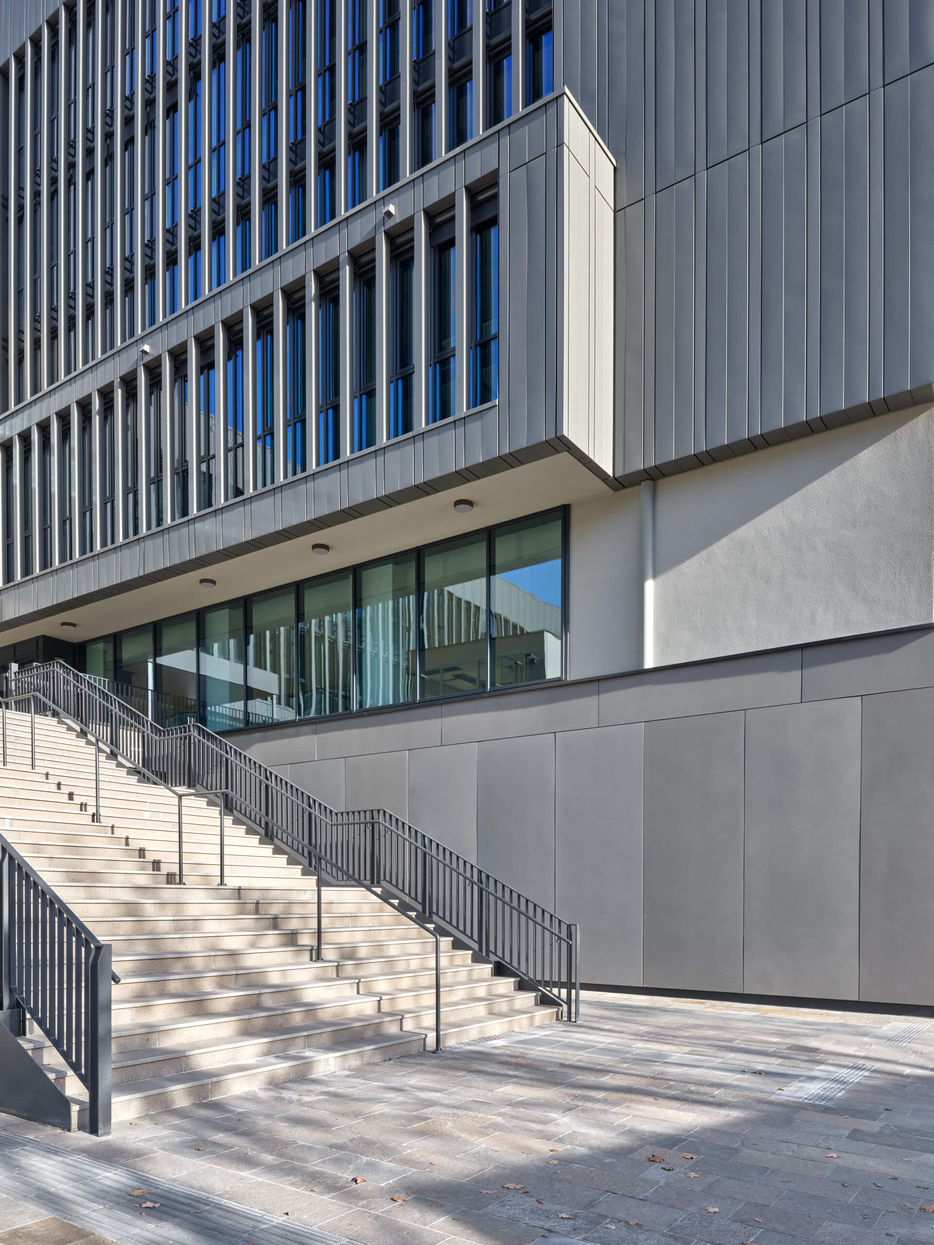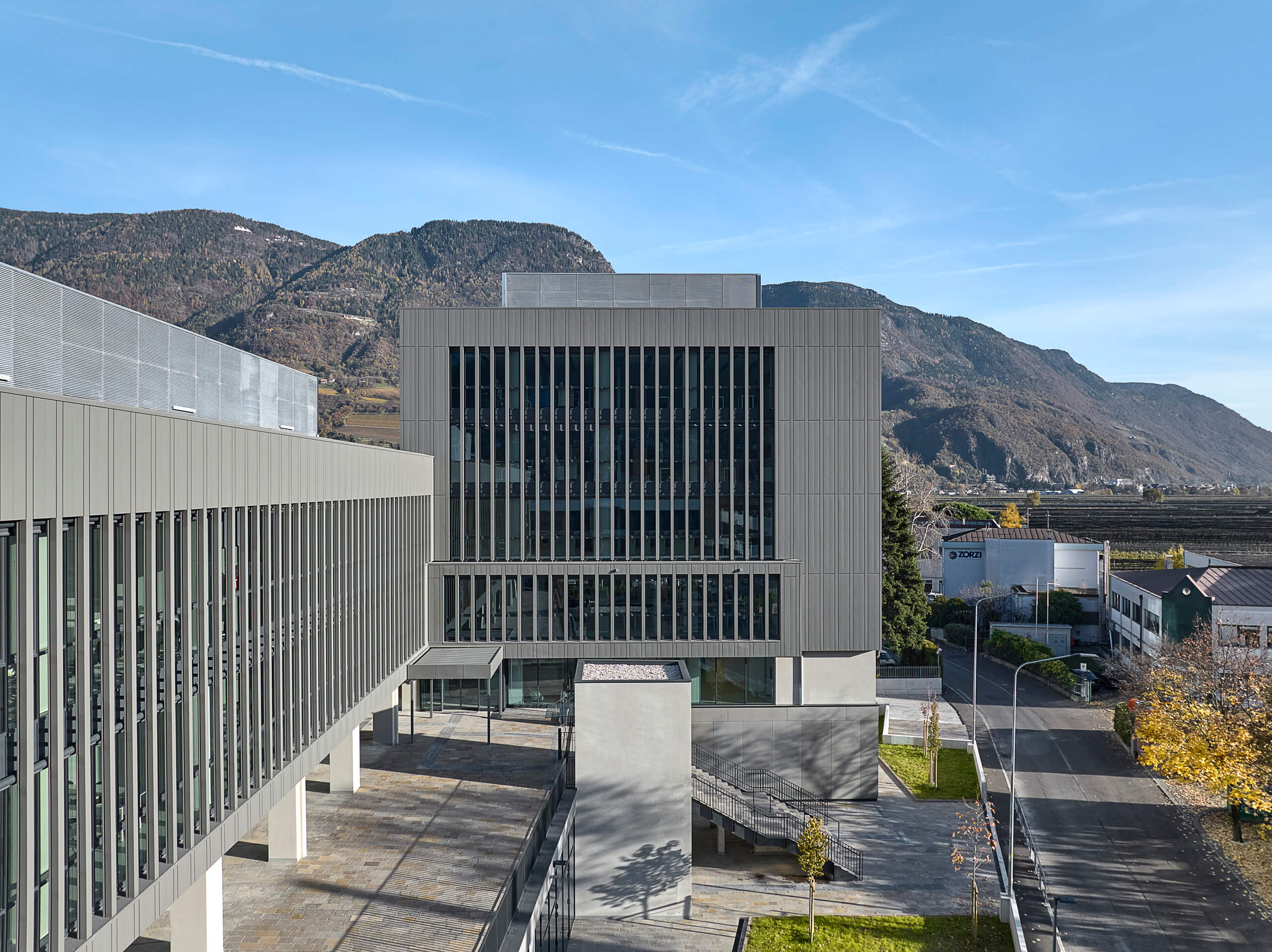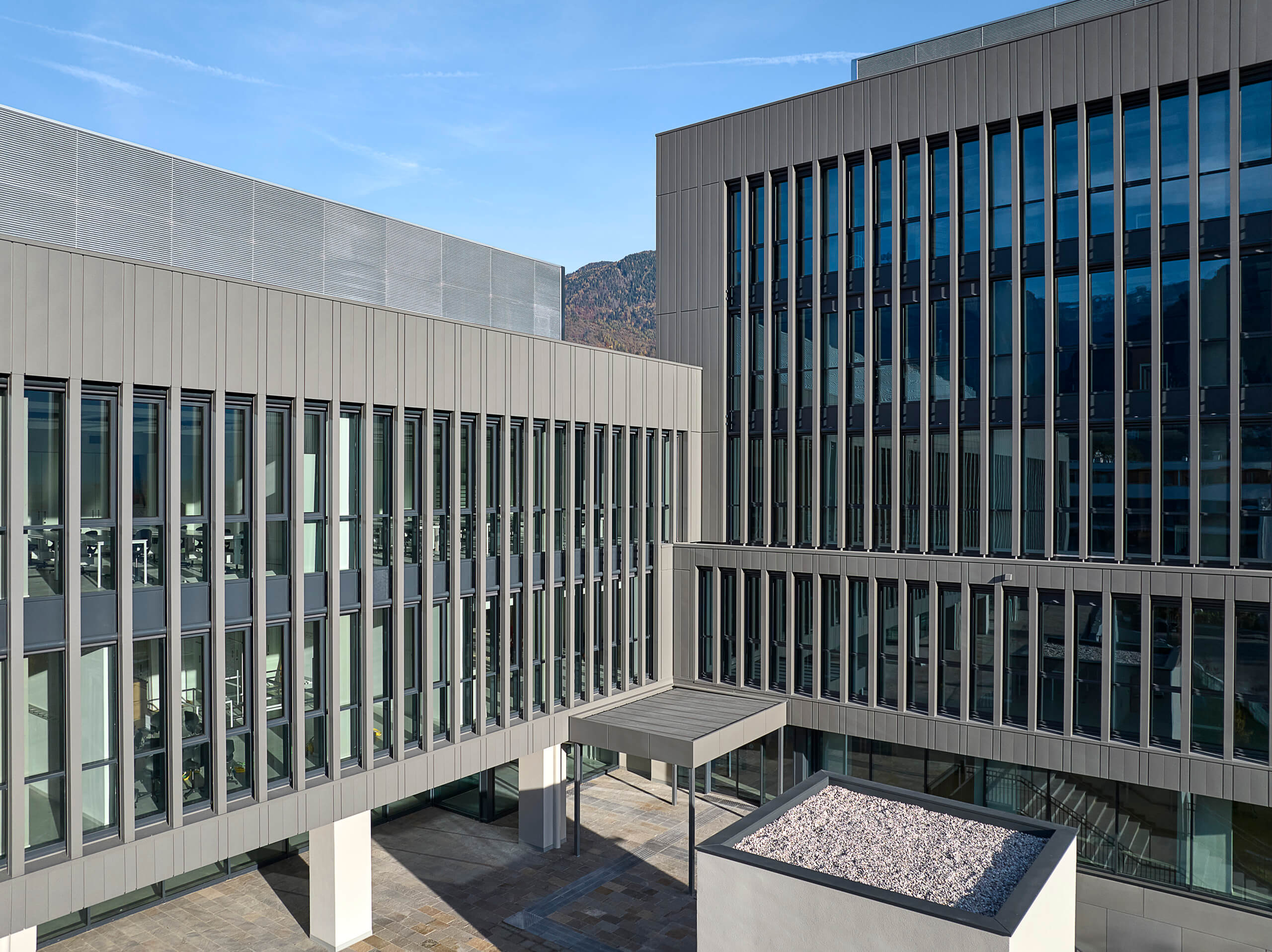 Il volume superiore è definito da un unico disegno di facciata: il rivestimento in zintek® organizza il rapporto tra pieni e vuoti e unisce valore compositivo e prestazioni tecniche. A seconda dell’esposizione e delle esigenze interne, il rivestimento alterna porzioni opache a zone filtranti, composte da lamelle verticali che schermano grandi superfici vetrate.