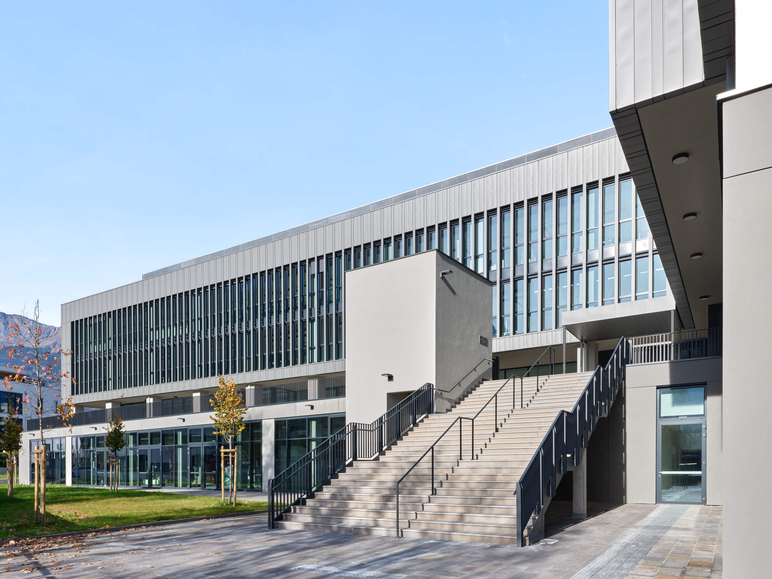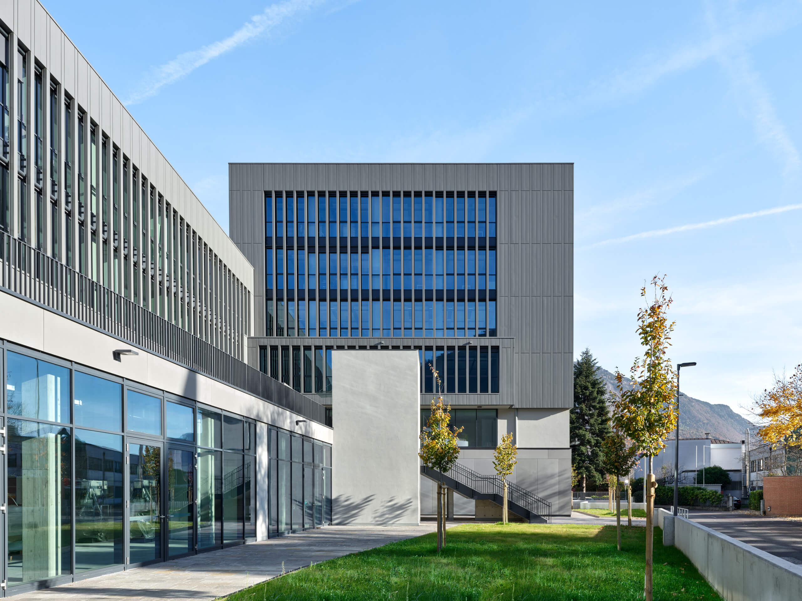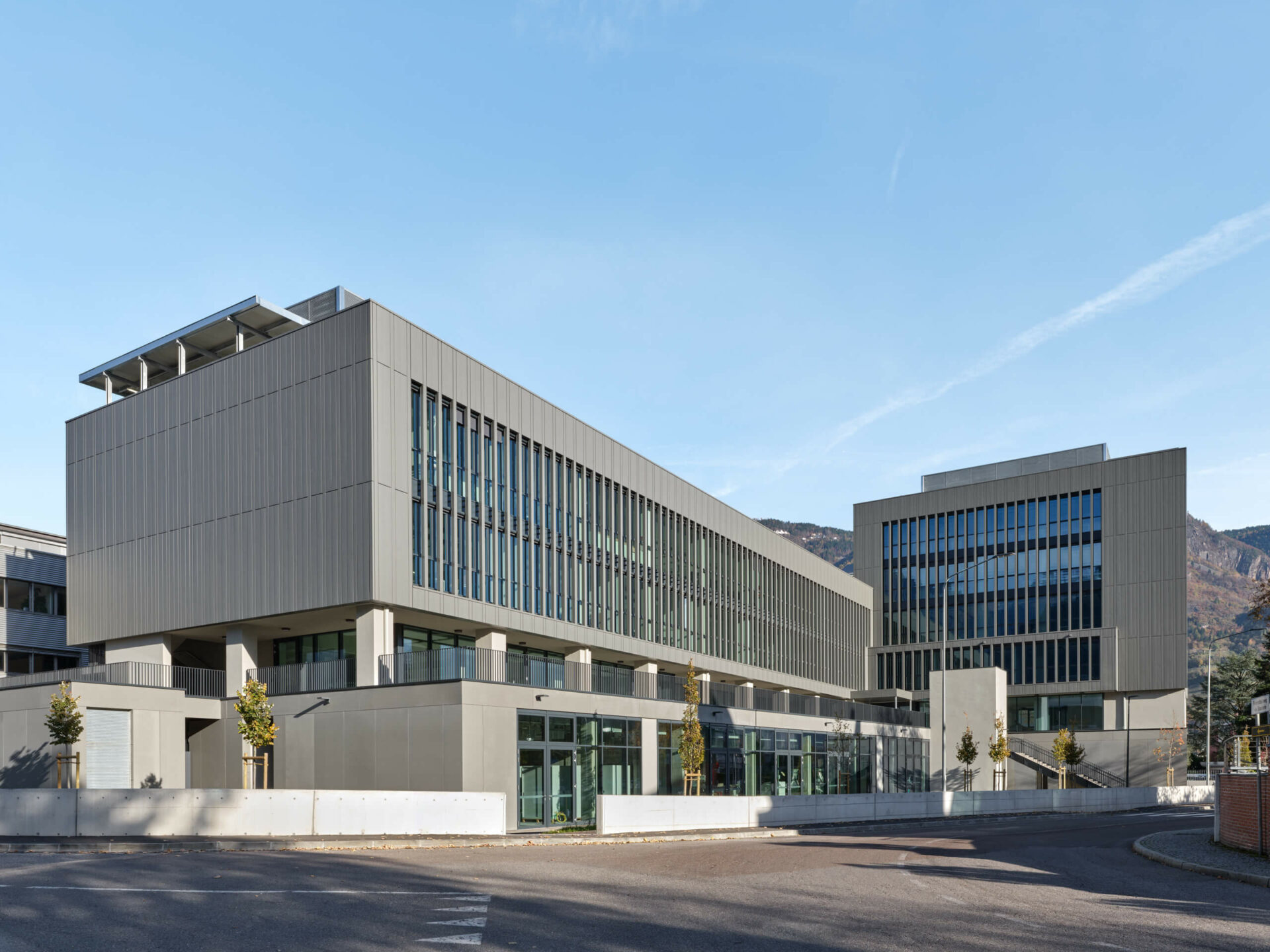Il nuovo plesso scolastico si configura come un’unica costruzione articolata in tre elementi: un podio, inteso come suolo artificiale che ridisegna il profilo del luogo con lo sfondo del crinale alpino, sul quale si appoggiano, in apparente sospensione un corpo longitudinale e uno più slanciato.
