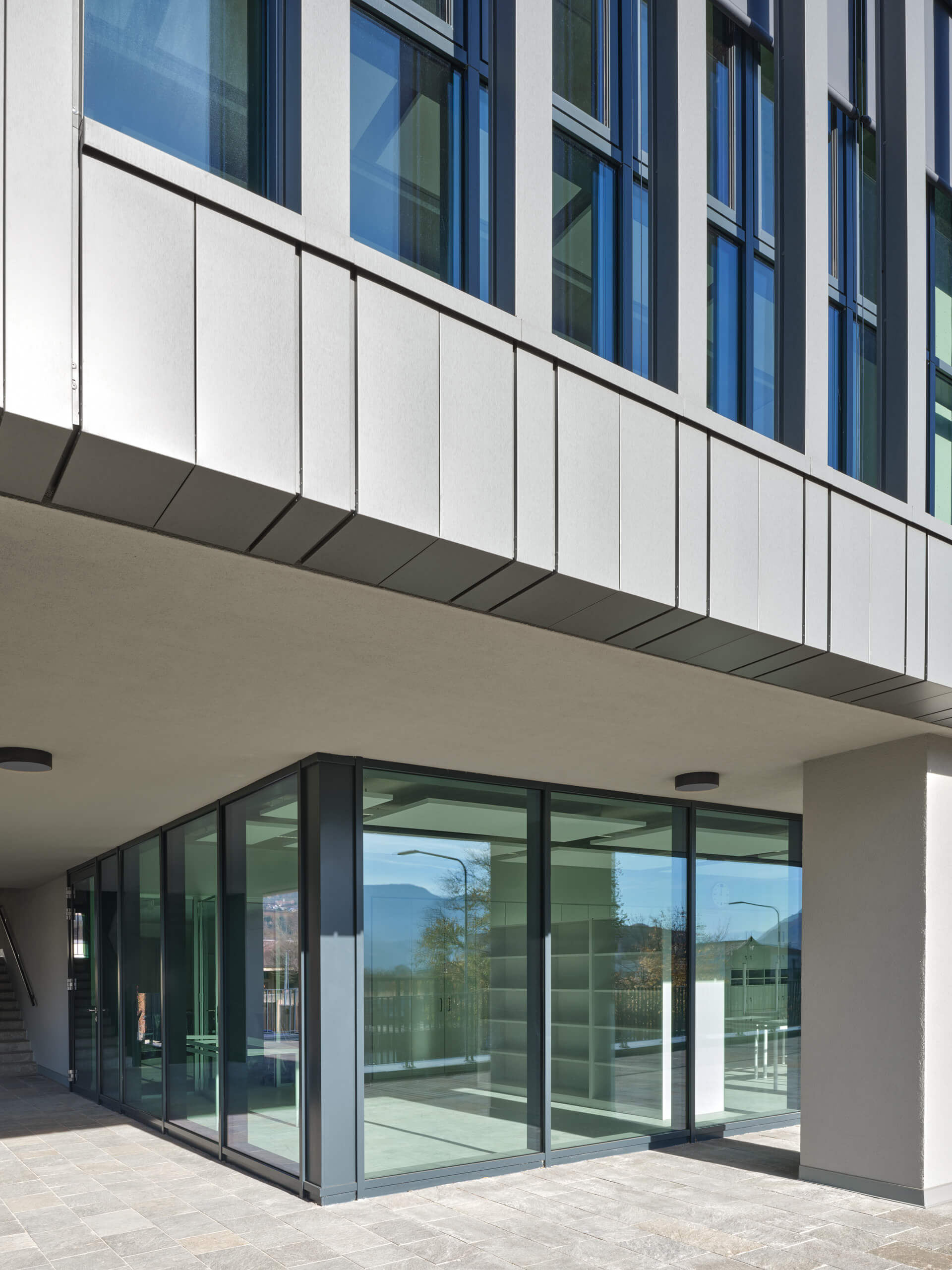 Il basamento è rivestito da pannelli compositi in matrice cementizia, realizzati con cemento grigio, inerti silicei e fibre di vetro di rinforzo, con buone prestazioni di impermeabilità e durabilità. Sul lato verso la strada, il basamento si apre con ampie vetrate che mettono in mostra i laboratori: da una parte rafforzano la continuità fra interno ed esterno e garantiscono luce naturale agli spazi didattici più tecnici, dall’altra permettono di vedere in real time le attività della scuola.
