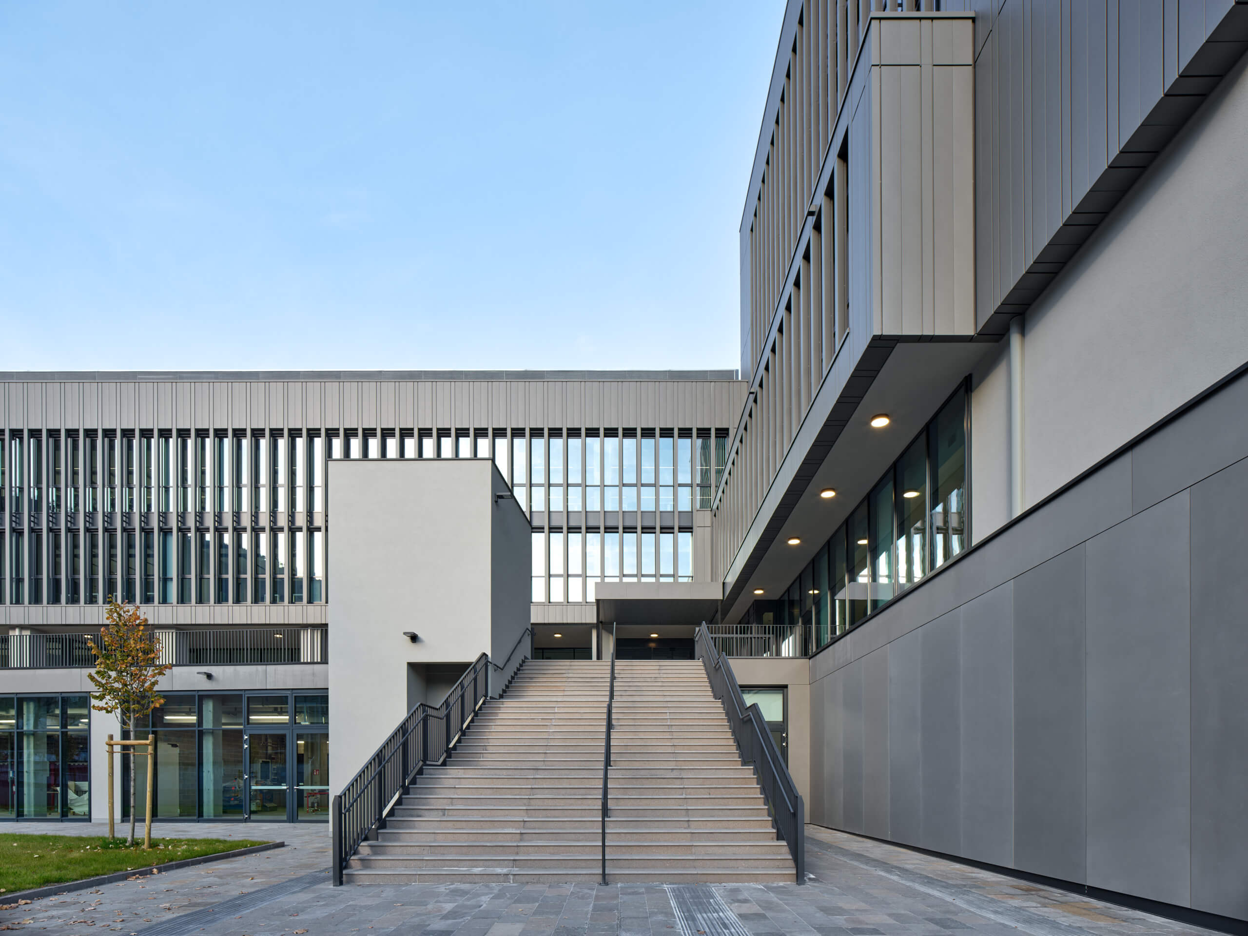 La torre semplifica ulteriormente la propria volumetria, affidando la definizione del proprio carattere alla pelle di facciata e a un lieve aggetto verso la piazza. Dietro al rivestimento in doghe verticali in zinco-titanio zintek®, modulare e ripetitivo, calibrato sull’interasse strutturale, si dispongono le aule e i laboratori, serviti da un corridoio centrale.