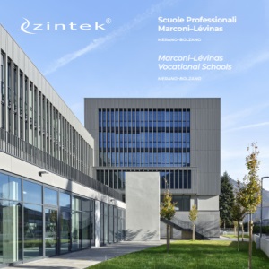 34 Il basamento è rivestito da pannelli compositi in matrice cementizia, realizzati con cemento grigio, inerti silicei e fibre di vetro di rinforzo, con buone prestazioni di impermeabilità e durabilità. Sul lato verso la strada, il basamento si apre con ampie vetrate che mettono in mostra i laboratori: da una parte rafforzano la continuità fra interno ed esterno e garantiscono luce naturale agli spazi didattici più tecnici, dall’altra permettono di vedere in tempo reale le attività della scuola. Il nastro vetrato del primo piano, che collega il basamento e i volumi superiori della linea e della torre, è un elemento leggero che proietta verso la piazza-parterre il grande atrio. Il volume superiore è definito da un unico disegno di facciata: il rivestimento in zintek® organizza il rapporto tra pieni e vuoti e unisce valore compositivo e prestazioni tecniche. A seconda dell’esposizione e delle esigenze interne, il rivestimento alterna porzioni opache a zone filtranti, composte da lamelle verticali che schermano grandi superfici vetrate. La scelta del materiale e del colore, valutata anche in termini di durabilità e resistenza, garantisce un buon inserimento nel contesto produttivo circostante e racconta la vocazione tecnica e professionale dell’istituto, contribuendo a costruirne un’identità architettonica chiara e riconoscibile. Rivestimenti The base structure is clad in fabric-reinforced cementitious matrix composite panels, made with grey cement and silica aggregate and strengthened with fibreglass, offering a good level of waterproofness and durability. The workshops on the base level are visible from the street side through large windows, which were included for two reasons: to strengthen the link between inside and outside and give natural light to the more technical teaching spaces, and to provide a real-time view of activities within the school. The glass “ribbon” on the first floor adds lightness to the building, connecting the base with the linear building and tower above and projecting the large atrium out towards the square-parterre. The upper volume has a single, unified façade design: the zintek® cladding defines the relationship between solids and voids and combines compositional value with technical performance. Fully opaque areas of cladding sit alongside sections that allow light to filter through — large windows shaded by vertical slats — depending on the specific exposure conditions and the needs of the inside spaces. The choice of material and colour — with durability and performance also considered — fits in well with the surrounding manufacturing environment and represents the institute’s technical and professional vocation, helping to give it a clear and recognizable architectural identity. Cladding